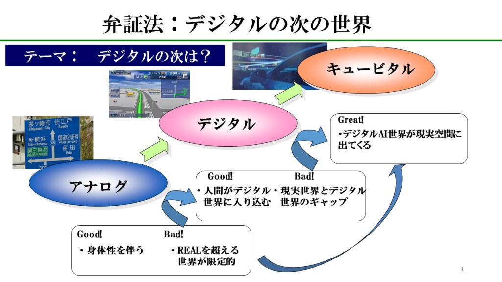 ②デジタル:カーナビのディスプレイの中にあるデジタル情報を見て、「次の交差点を右に曲がると六本木」という判断をする(=デジタルは、ディスプレイの中にいる)