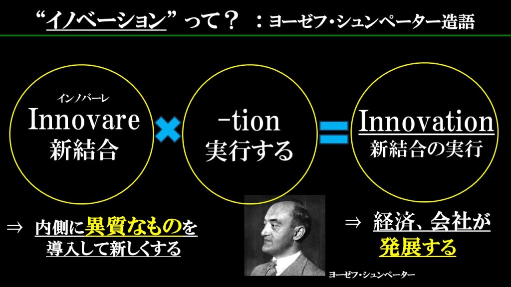 イノベーションは、『内側に異質なものを導入して新しくする(新結合:Innovare)こと』を実行(:-tion)して、経済や企業が発展することです。