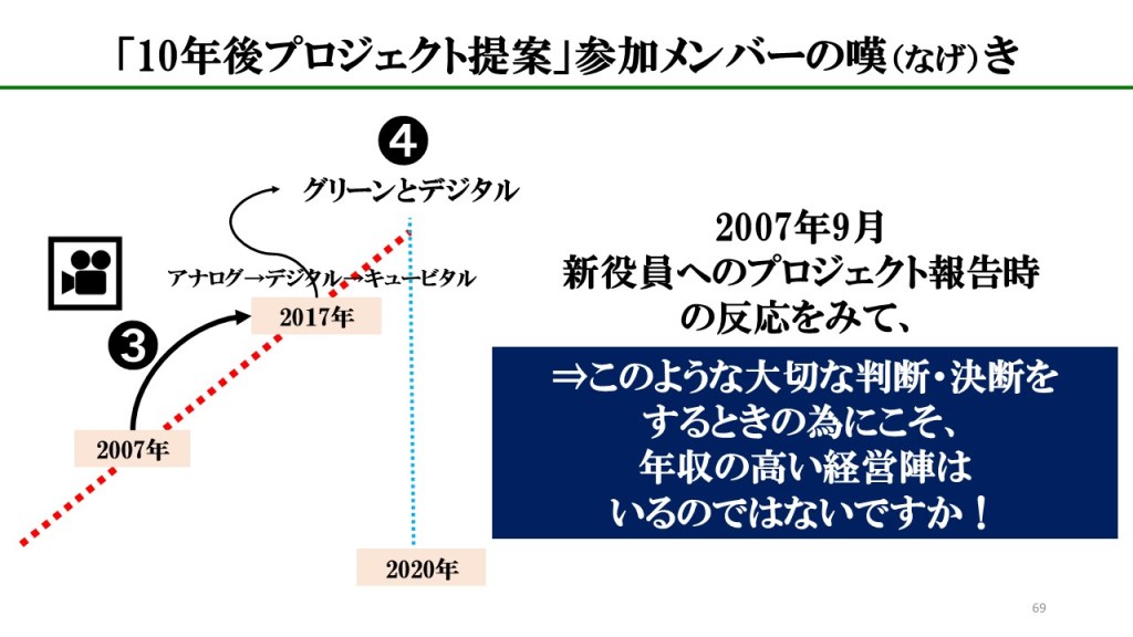 ・たまたま、私が二つの委員会を兼ねていたこともあって、12年後の2005年前後に、経営に大きなインパクトが起こることが洞察されること。そのため、7年後の2000年くらいまでに次の「稼ぎ頭」開発に注力することが求められる旨の発表を経営会議で行いました。