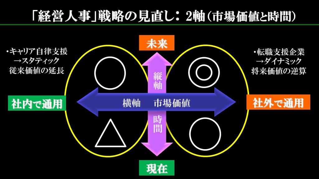 ■ 「経営人事」戦略の見直し:「市場価値軸(横軸)」と「時間(縦軸)」という2軸