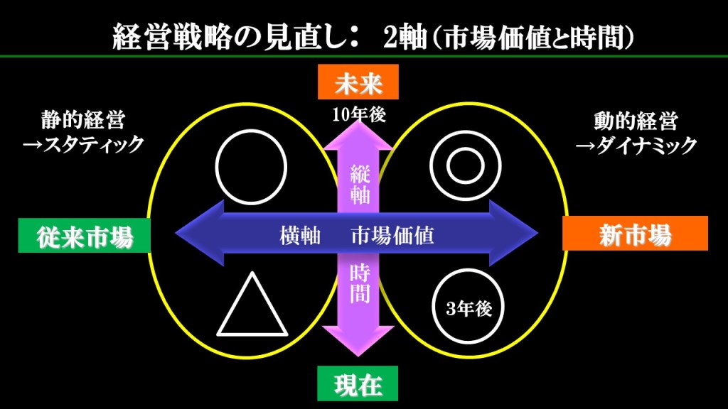 ■ 「経営戦略の見直し」:「市場価値軸(横軸)」と「時間(縦軸)」という2軸