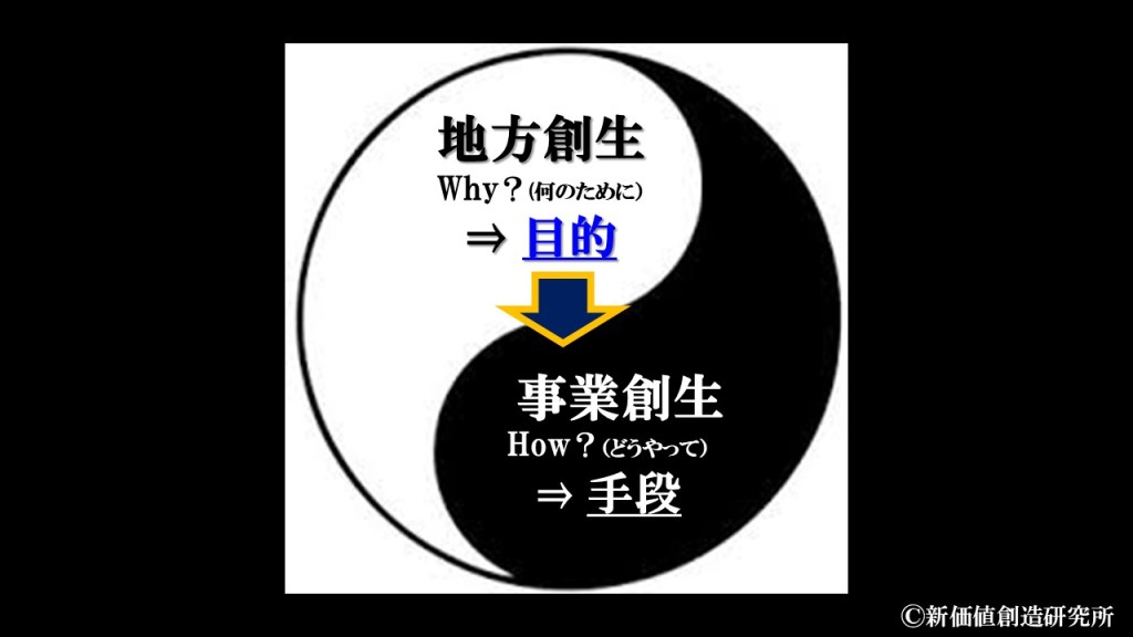 この「A.地方創生(目的:何のために)」と「B.事業創生(手段:どのようにして)」はコインの裏表です。