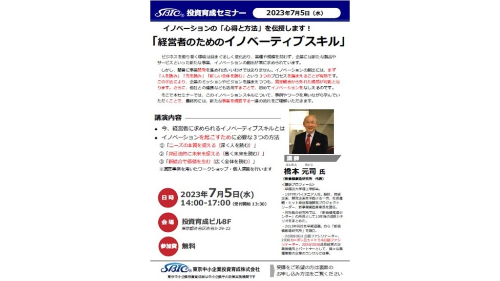 ■2023年7月5日 東京中小企業投資育成 SDGsセミナー テーマ:経営者のためのイノベーティブスキル 投稿日: 2025年10月6日 投稿者: 橋本元司 共有: クリックして X で共有 (新しいウィンドウで開きます) X Facebook で共有するにはクリックしてください (新しいウィンドウで開きます) Facebook いいね 読み込み中…