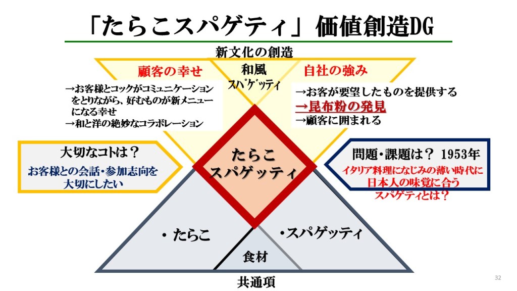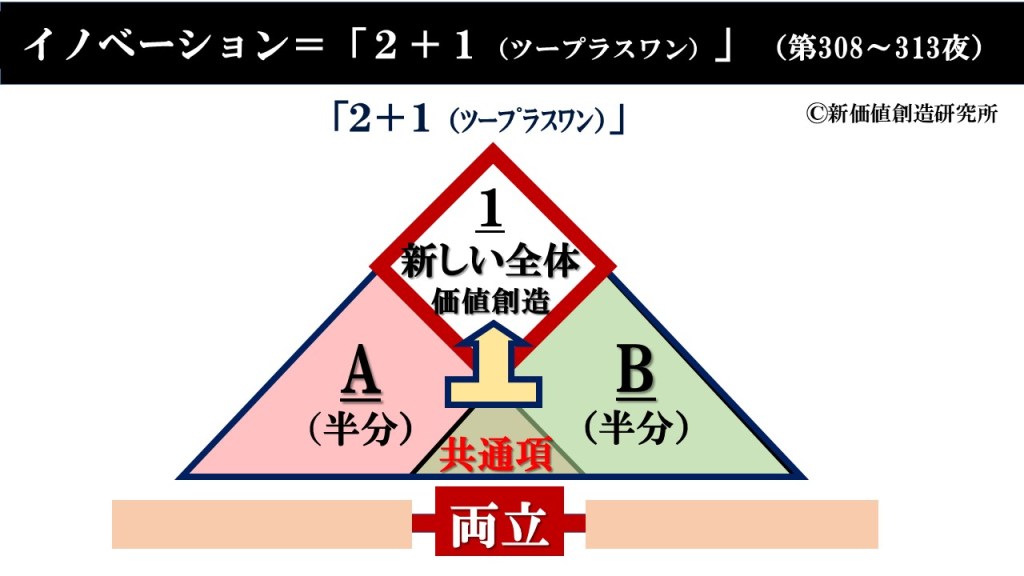 ・「広い知」は、空間上で異質な複数のモノ・コトを両サイドにおいて、二つを結びつけて1レベル上の価値を創出する「横の新結合」です。