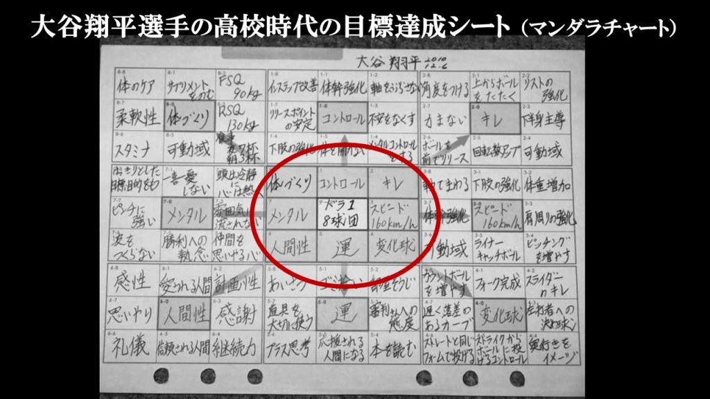 上図について、中学生、高校生、大学生、社会人が納得されるコンテンツが、「大谷翔平選手の高校時代に目標達成シート」(下図)です。「なりたい姿からの逆算」が現在を変えていくのが実感できます。