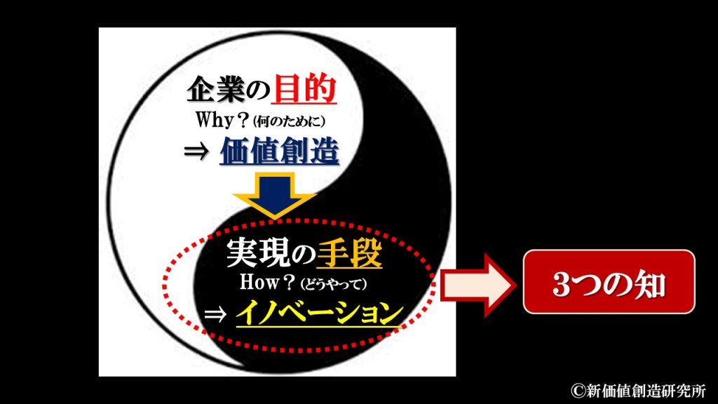 「顧客価値の創造」とは、「世の中に役立つ未来を先取りすること」を目的(鍵穴)として、「イノベーション(3つの知)」の方法(鍵)を通して実現することにあります。下図の様に、「価値創造」と「イノベーション」」はコインの裏表です。