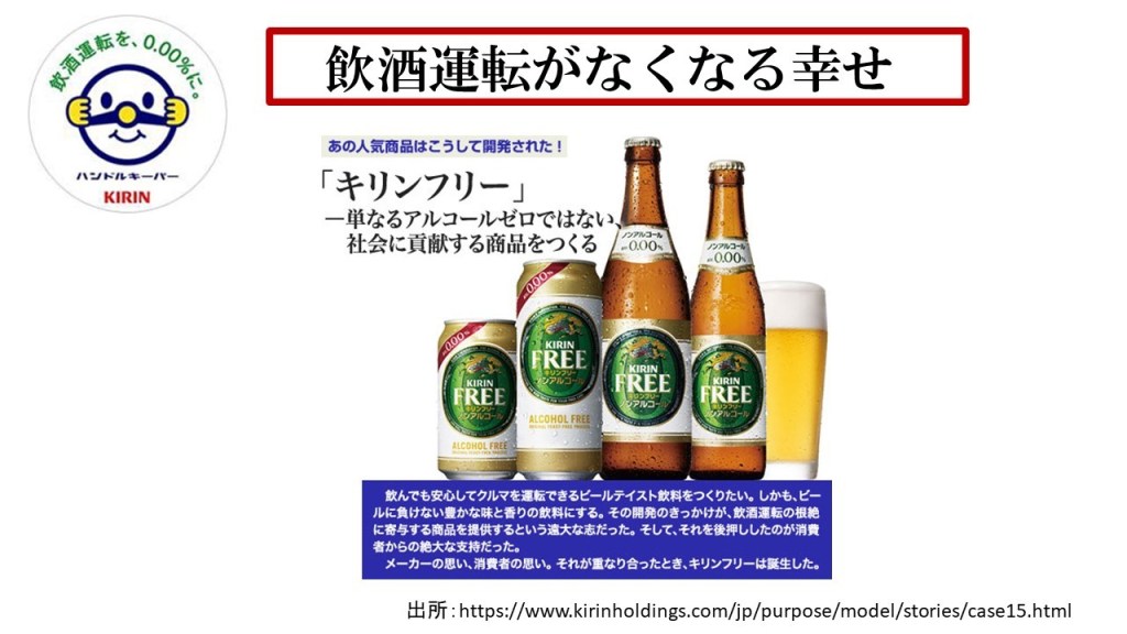 さて、ビール事業にとってのコアは“酔えるアルコール”です。その一番のコアを無くしてしまうのは凄い決断だと思いませんか?でも、女性開発者にとって重要な熱い想いは、“飲酒運転のない幸せ”でした。本業と社会課題(飲酒運転)が結合して、ここから「アルコールフリー」という新しいビール市場(新事業)が創出されました。
