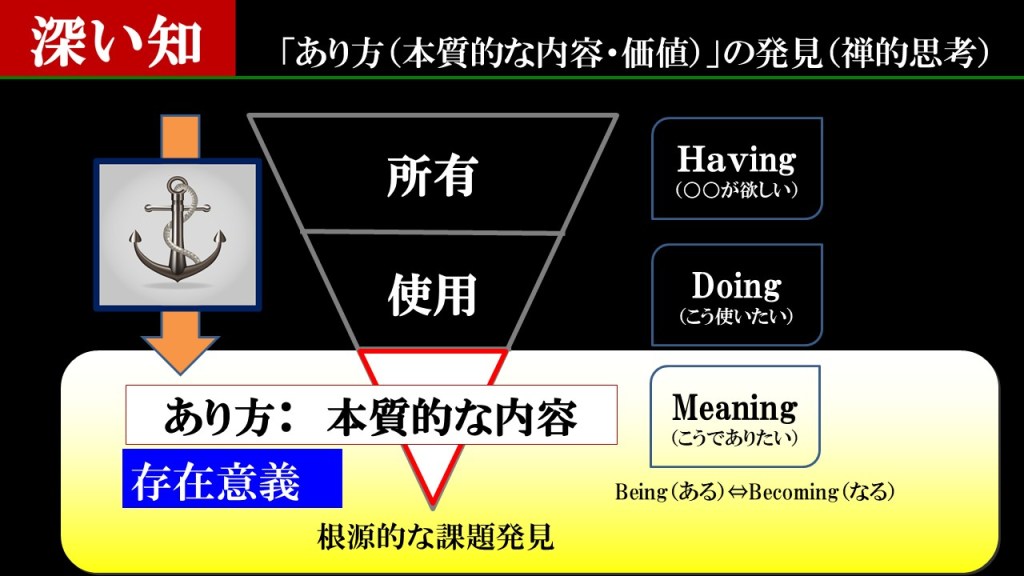 ・『深い知』は、「大切にすることは何か」という事業の再定義につながり、ミッション(使命)を生み出します。自分達が何に「命を使う」のかに関わってきます。当然、ワクワクするものに命を使いたいですよね。船でいう錨(アンカー)の役割です。