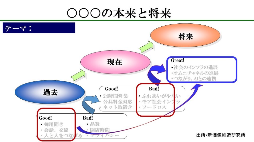 ポイントは“A: 過去のGood!”という現在の中では薄れてしまったものが、“B: 現在のBad!(社会課題)”と新結合することで、新しい全体として、“C: 将来のGreat!”に甦ってくるという図式です。