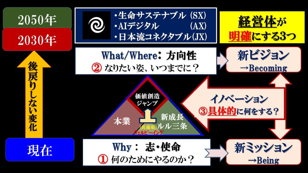 「生命サステナブル(SX)」「AIデジタル(AX)」という不確実で不確定なものには慎重になる。慎重になると、行動や決断が先送りされる。果報は寝て待てになる。それが、日本の停滞を生み出した「原因・源」です。ここから脱皮する手段が「価値創造の習得と実装」です。