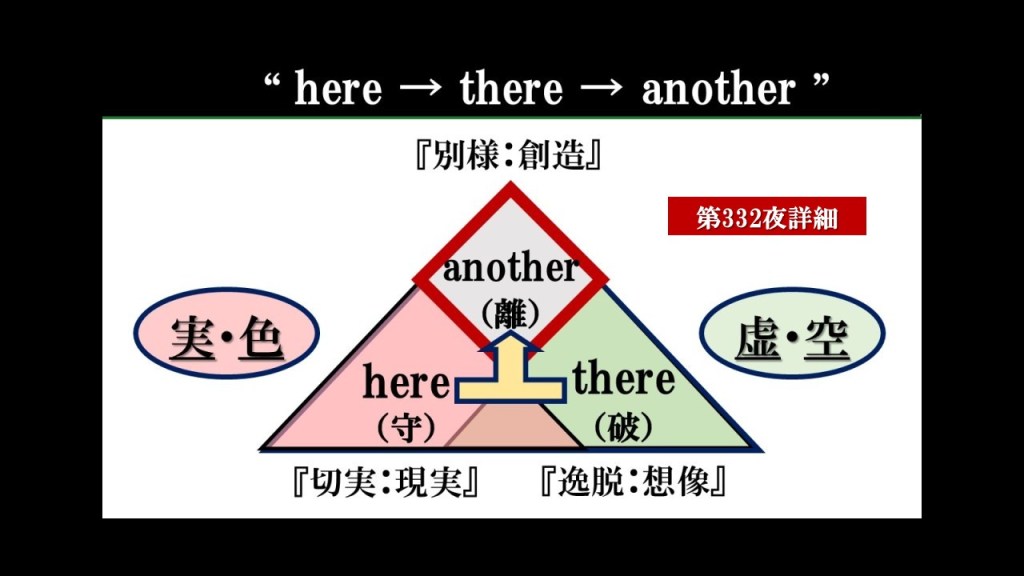 「日常的な現実世界(実・here・One)に身を置きながら、真理や未来世界(虚・大元・there・Another)の視点に立って物事を考えることは難しい。むしろ、真理や未来世界のAnother視点(虚・大元・there)に立ちながらこそ、日々の現実的な行動(実・here・One)を適切に行うことが必要である」
