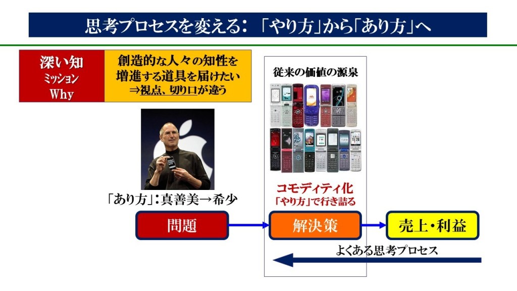 アップルのスティーブ・ジョブズは、「創造性とは、モノゴトを結び付けることにすぎない」と言いました。上図の「つなげる力」です。是非、時間軸(高い知:温故知新)、空間軸(広い知:主客一体)のそれぞれで「結び付けること、つなげること」に挑まれてください。
