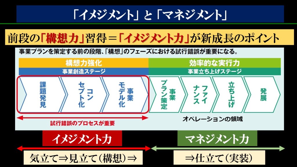 参考ですが、「想像力(心)」と「創造力(智慧)」は、ビジネスの後工程である「マネジメント」領域ではなく、前工程の「イメジメント」の領域(下図)であることを申し添えます。(第7夜、第82夜、第312夜詳細)