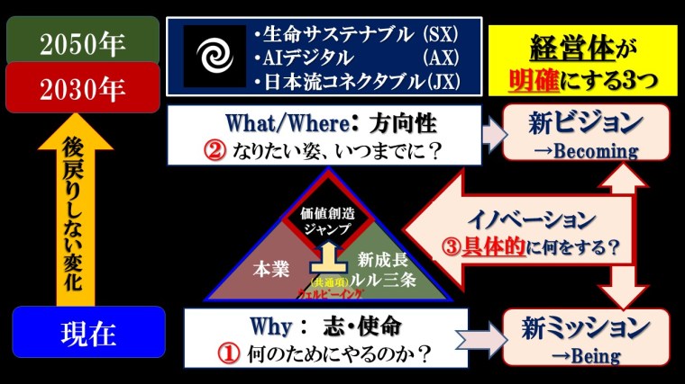 さて、本当にAnother(別流)である「生命サステナブル(SX)」&「AIデジタル(AX)」は不確実で不確定なのでしょうか?このコラム「価値創造の知」第361夜で、下記「新成長ルル三条(SX・AX・JX)」を記してきましたが、それらは後戻りしない変化(X=トランスフォーメーション)であり、確実で確定したものです。この成長領域に10年間尽力してきました。