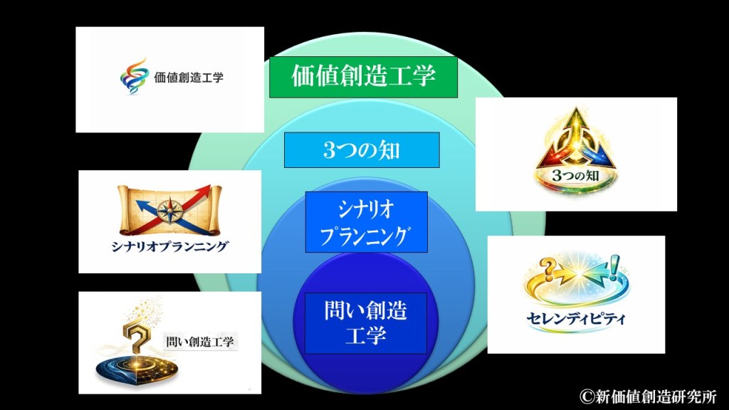 「問い」を立て、「シナリオ」で未来を広げ、「3つの知」で己を貫き、「価値創造工学」で形にする。