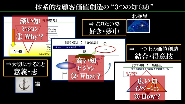 「問い」(気立て)を起点として「解くべき領域」を地図(面)で広げてきました。ここで、「価値創造プロセス」の真打(しんうち)である「3つの知」に統合して、面を立体に立ち上げていきます。